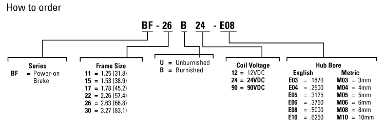 Brake, 摩擦, Power On brake, BF系列-11, 1.25 英寸 Outside Diameter, 0.3125 英寸 Bore, 24 Vdc, 5.0 in-lbs 靜態力矩